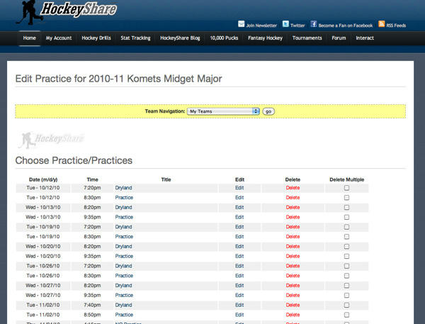 When you click on “Edit Practices” next to your team under “Stat Tracking” – you will now see all the practices currently entered into the system in an easy-to-read grid format (complete with highlighting when you mouse-over the rows). You can now edit, delete, or delete multiple practices directly from this page. Hopefully this feature will save you lots of time when your practice schedule changes throughout the season. Check out the screenshot below to see exactly what we’re talking about.